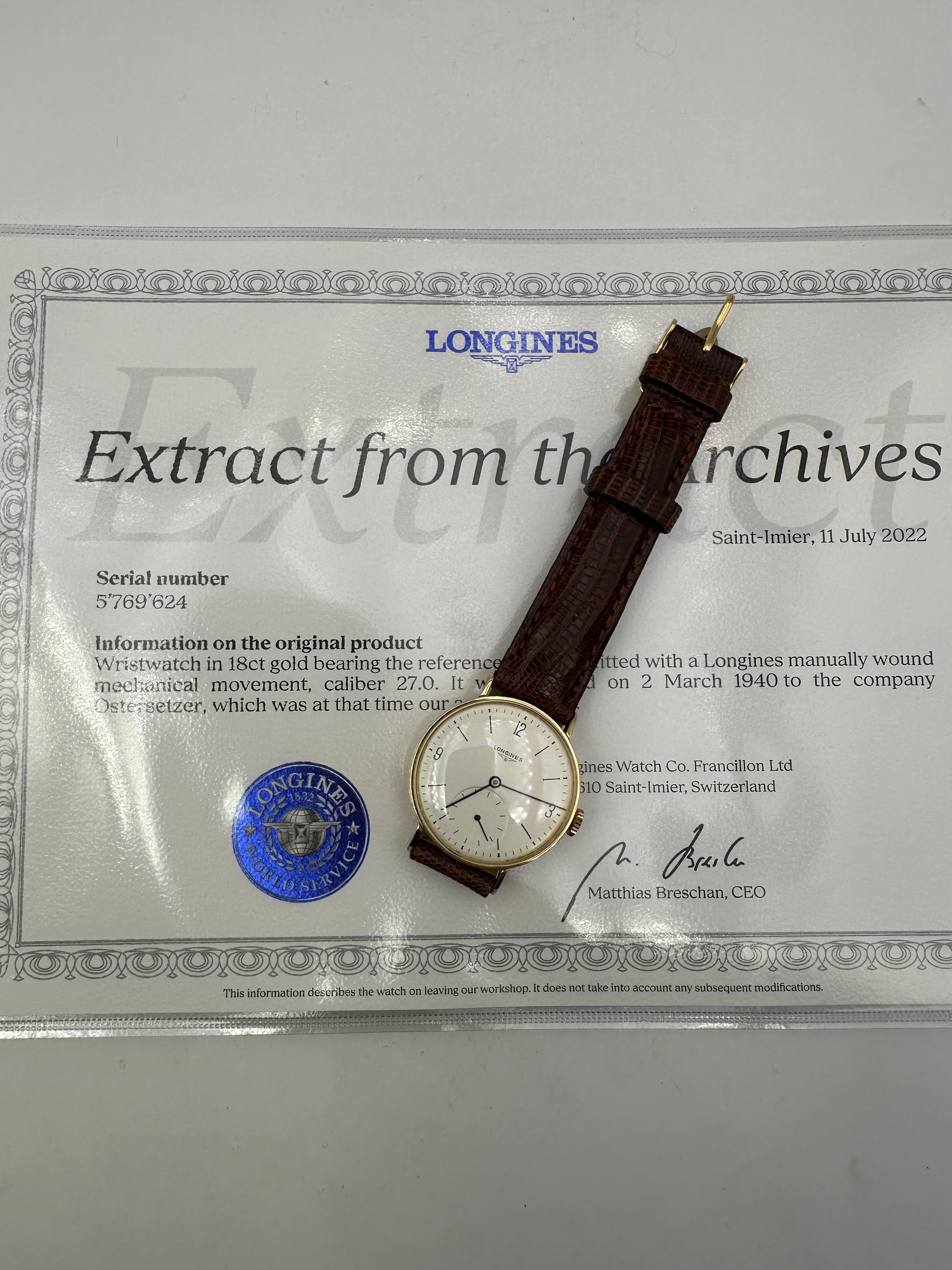 1940 Longines - 4178 Oro 18K Calibro 27.0 + Estratto Archivio Originale